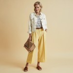 Stylish 40-Year-Old Woman with Short Hair in Yellow Trousers and White Denim Jacket