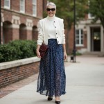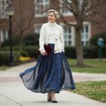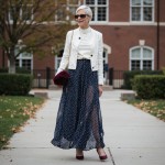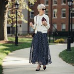 Imagine a 40-year-old highly stylish woman with modern hair styles, short. she is wearing a chiffon navy and white small polka dot skirt to her ankles. high heels. a MATCHING tight fitted white sweater with a short button front cardian--a twin set. Both in same color. an oversized clutch bag in wine. back ground scene should be a college campus.