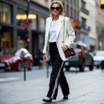 Stylish Woman in Black Adidas Track Pants and White Blazer Holding Burgundy Clutch
