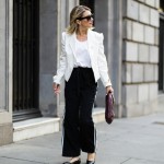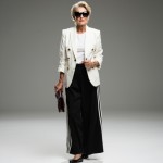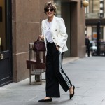 imagine a 40 year old stylish, pretty woman wearing black wide Addias Track pants in black with white stripe down the side of leg, black ballet flat shoes, white expensive looking blazer with gold buttons and with white tee shirt and a burgandy cluth bag in rectangle shape in her hand. and black sunglasses.