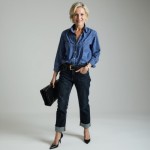 Imagine a 40-year-old woman who is highly stylish and very pretty. Hair is short. she is wearing straight slim jeans to the ankle. Wash is dark wash denim. she is wearing a blue pinstripe shirt that is partially tucked into jean. black belt. black kitten heels with point toe. she is carrying a large black clutch bag.