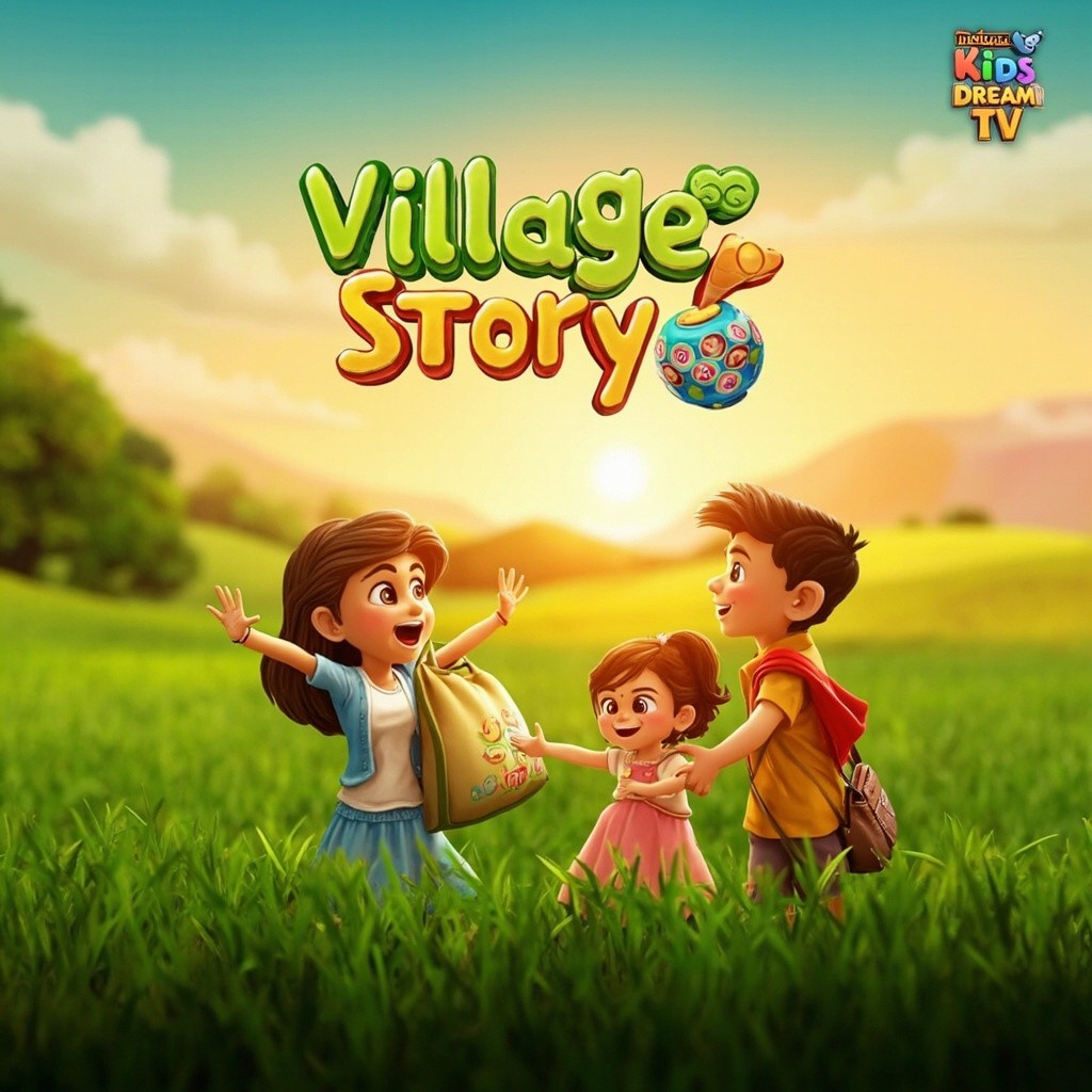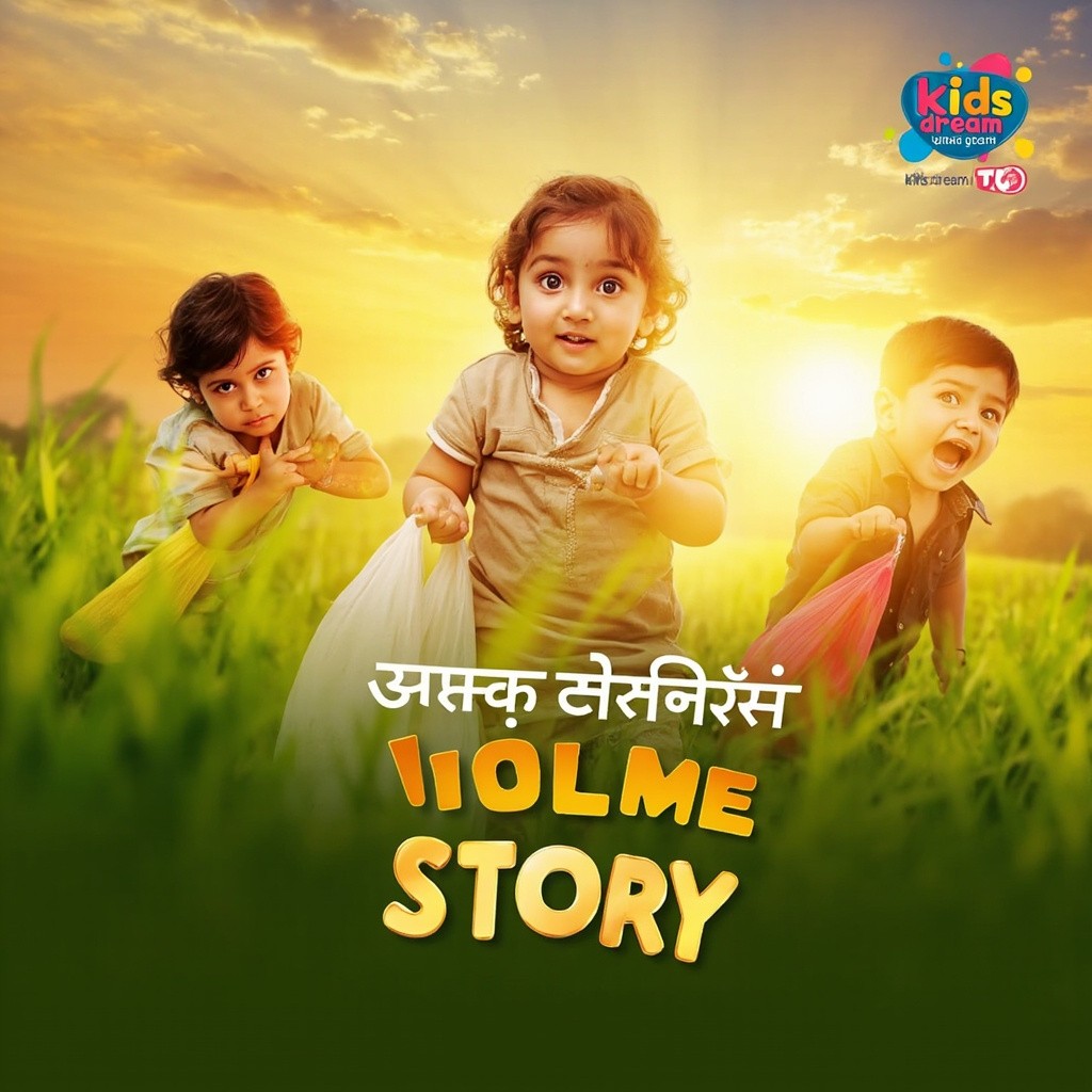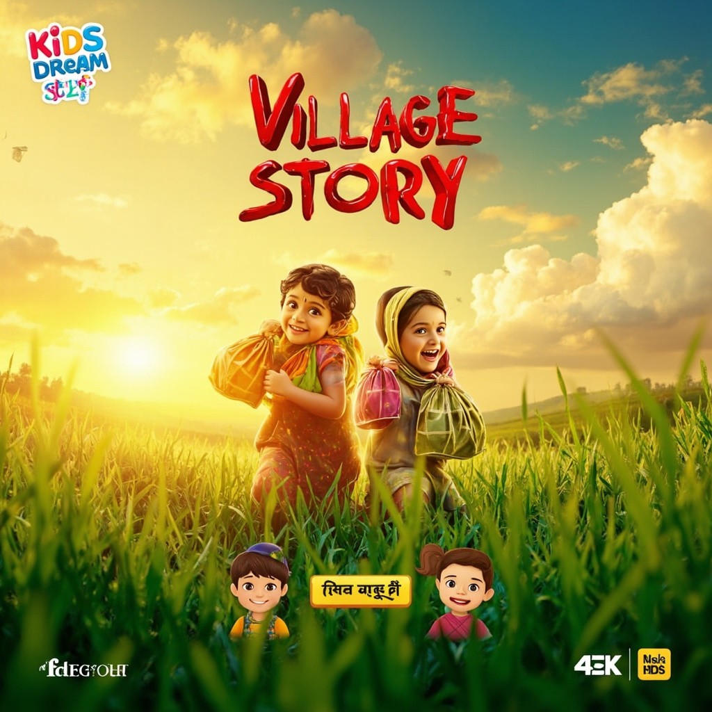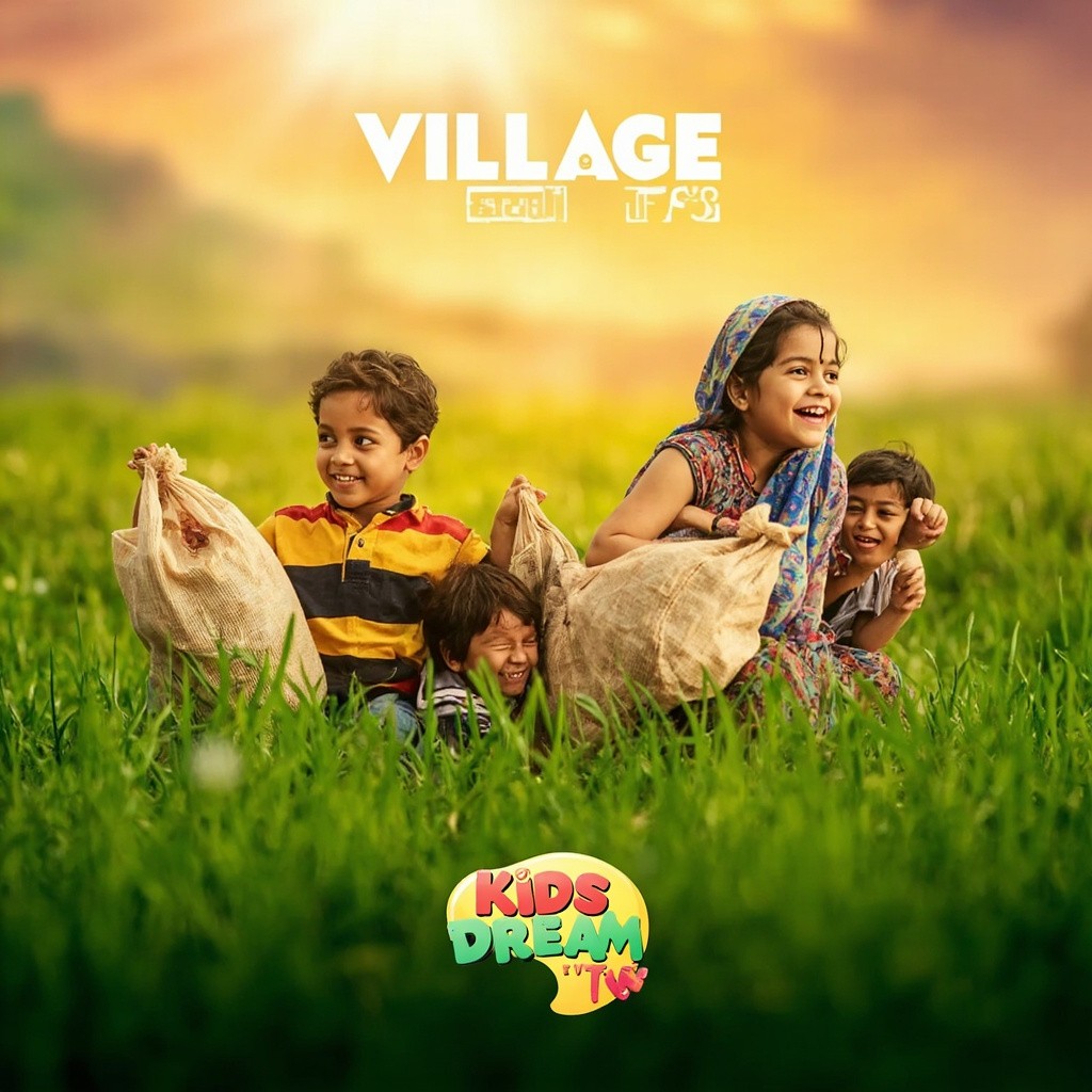 Kids Dream TV Logo, Sunrise Glow on Green Fields with Happy Faces and Hindi Text 'गाँव की कहानी'