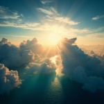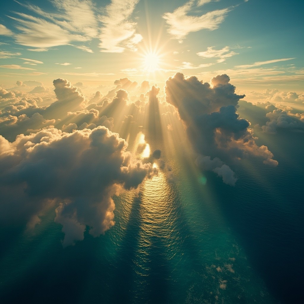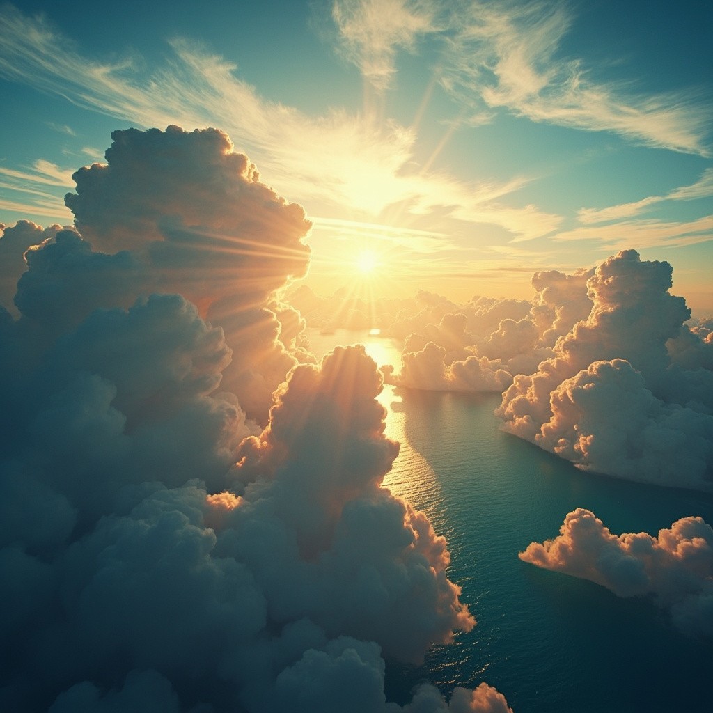 A breathtaking, surreal view from above the clouds, capturing a dramatic sky during golden hour. Thick, fluffy clouds tower upwards like majestic mountains, lit warmly by the setting sun. The sunlight reflects on the turquoise-blue ocean below, casting shimmering highlights across the water. The sun is glowing intensely with radiant beams spreading across a deep blue sky filled with wisps of cirrus clouds. The scene evokes a sense of peace, wonder, and elevation — like floating in a dreamworld above Earth. Ultra-realistic, 8K resolution, cinematic lighting, magical and serene atmosphere."