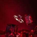 Product photography without diamond ring with red ruby as a center gem stone, with red and maroon as the main colors, the ring suspended in mid-air, along with large sparkling large red crystal blocks - all confined in the center of the composition. The background is an dark red gradient. High-resolution photography by Alex Prager, commercial product photography, advertising photography, advertising posters. Product photography, high quality, high detail, high definition.