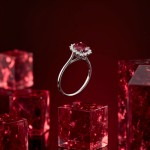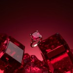 Red Ruby Diamond Ring Suspended Amid Crystal Blocks with Dark Red Gradient Background