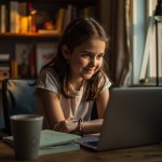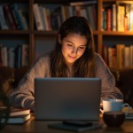 Teenage Girl Studying with Laptop in Cozy, Book-Filled Room