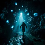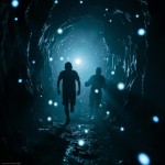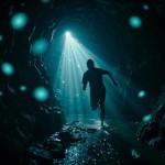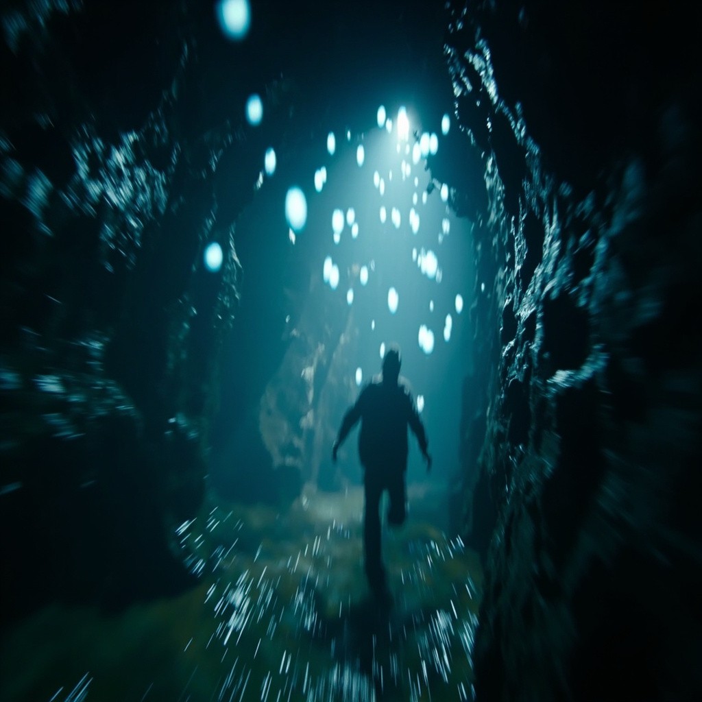 Terrified Person Running in Dark Limestone Cave with Glowing Orbs and Shadow Figures