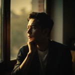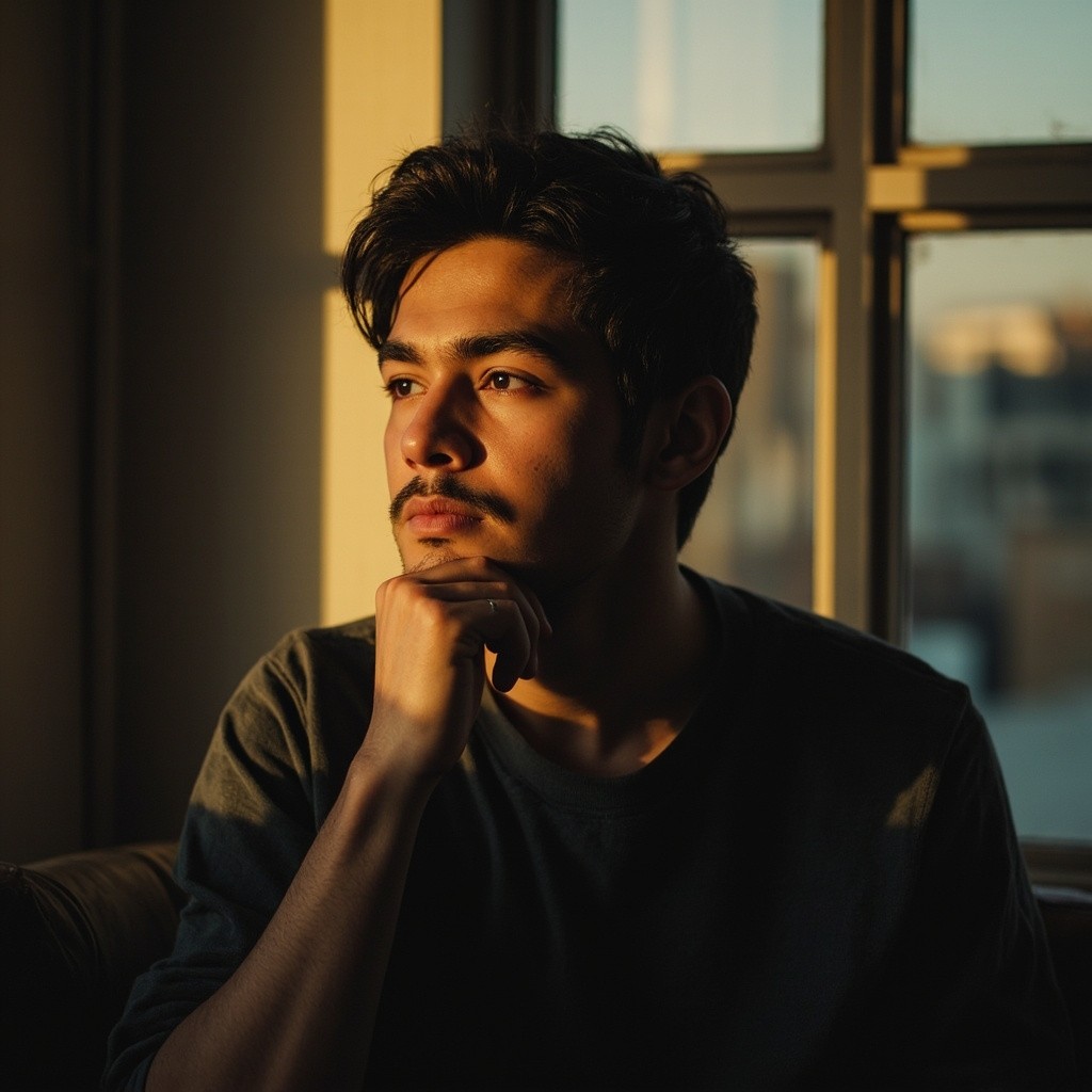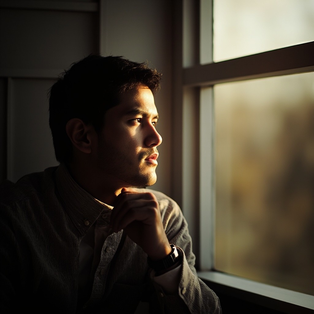 A young man sitting alone near a window, resting his chin on his hand, looking outside with a thoughtful expression. Soft warm sunlight coming through the window, casting shadows on his face. The background is slightly blurred, giving a peaceful and calm mood. The man looks deep in thought as if remembering something important. Realistic detailed skin texture, soft focus, cinematic lighting, high resolution, 4K.