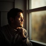 Young Man Near Window in Thoughtful Pose with Sunlight Shadows