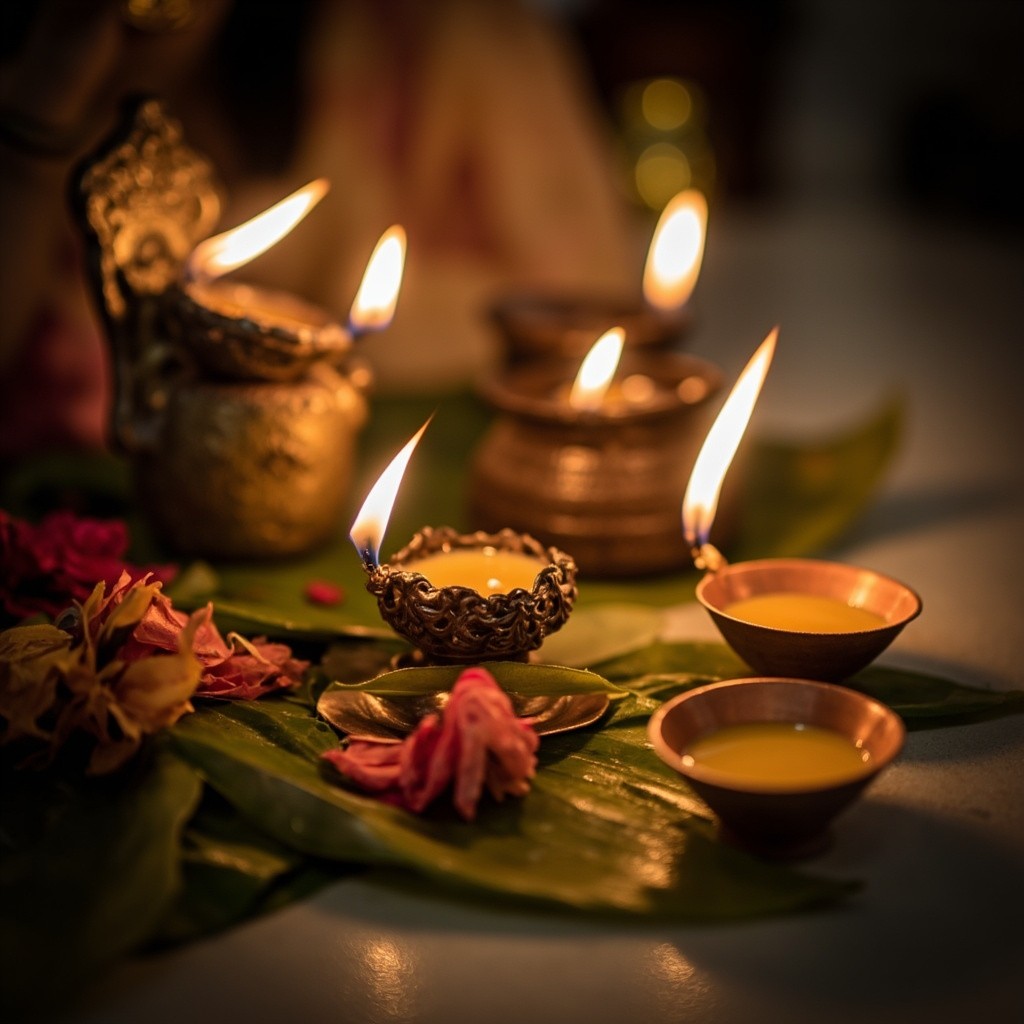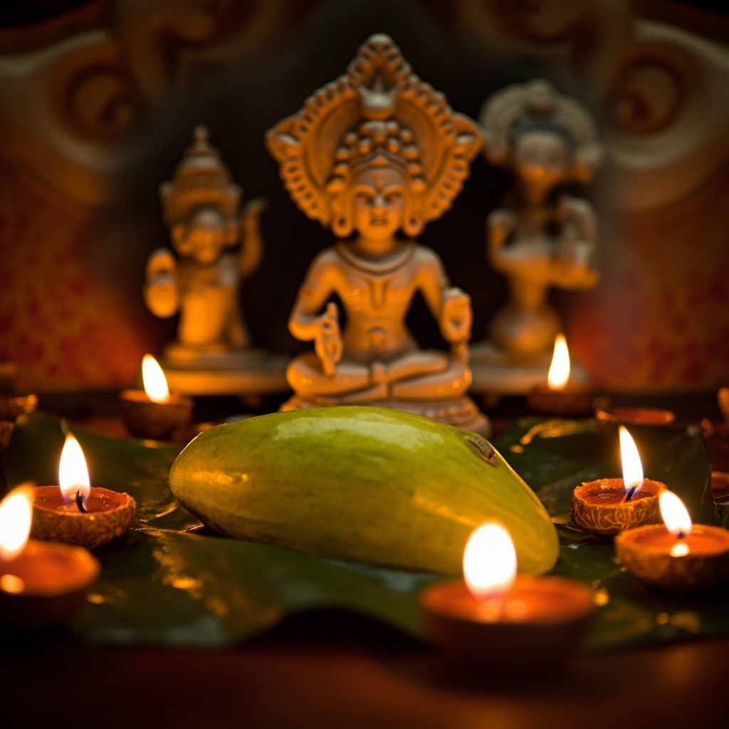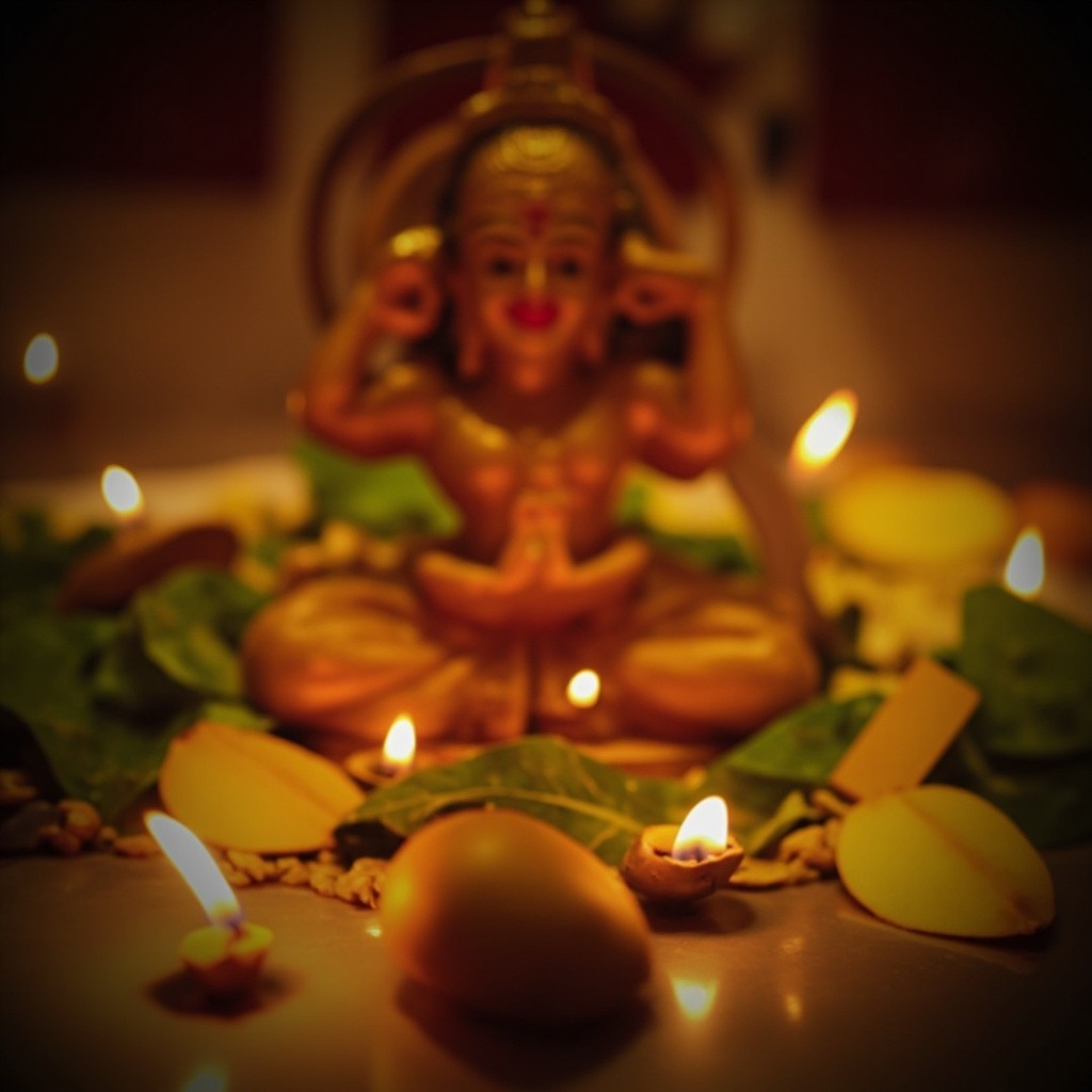 Traditional Varamahalakshmi Puja Setup with Idol, Mango Leaves, Lamps