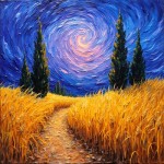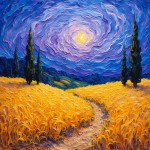 Wheat Fields and Cypress Trees under Twilight Sky, Brushstroke Texture