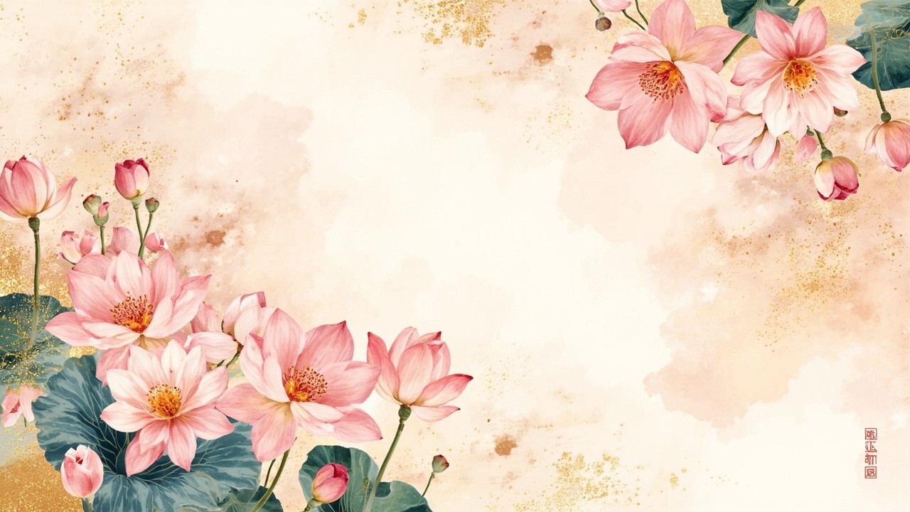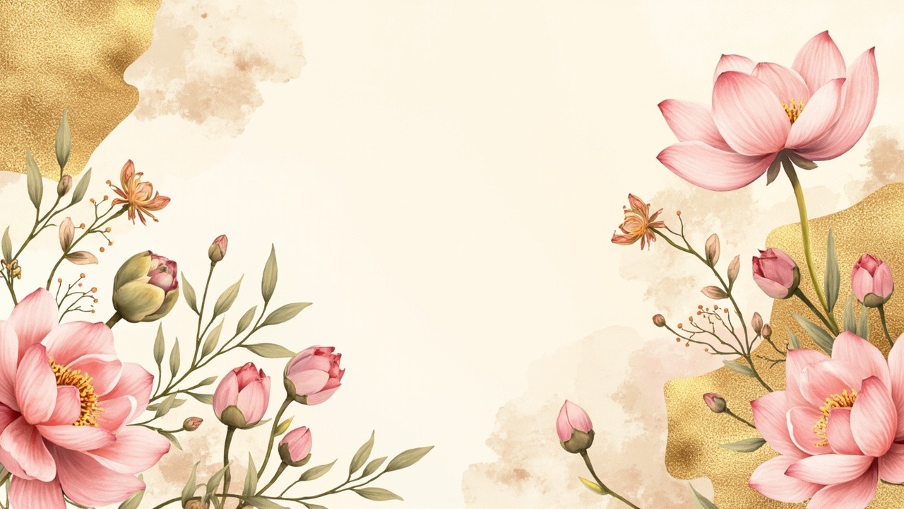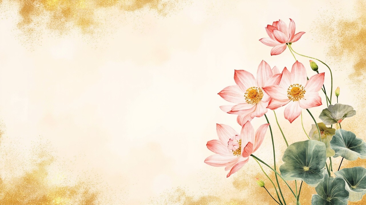 157. Spring floral in watercolor vector background. Luxury wallpaper design with lotus flowers, line art, golden texture. Elegant gold blossom flowers illustration suitable for fabric, prints, cover. illu, photography, ultra-realistic, modern aesthetic, clean design, vibrant colors, bright lighting, high contrast, natural environment, realistic textures, sharp focus, professional DSLR, 35mm lens, stock photo style, 8k, photorealism, no vintage, no retro, no antique, no old-fashioned, avoid grunge, avoid patina