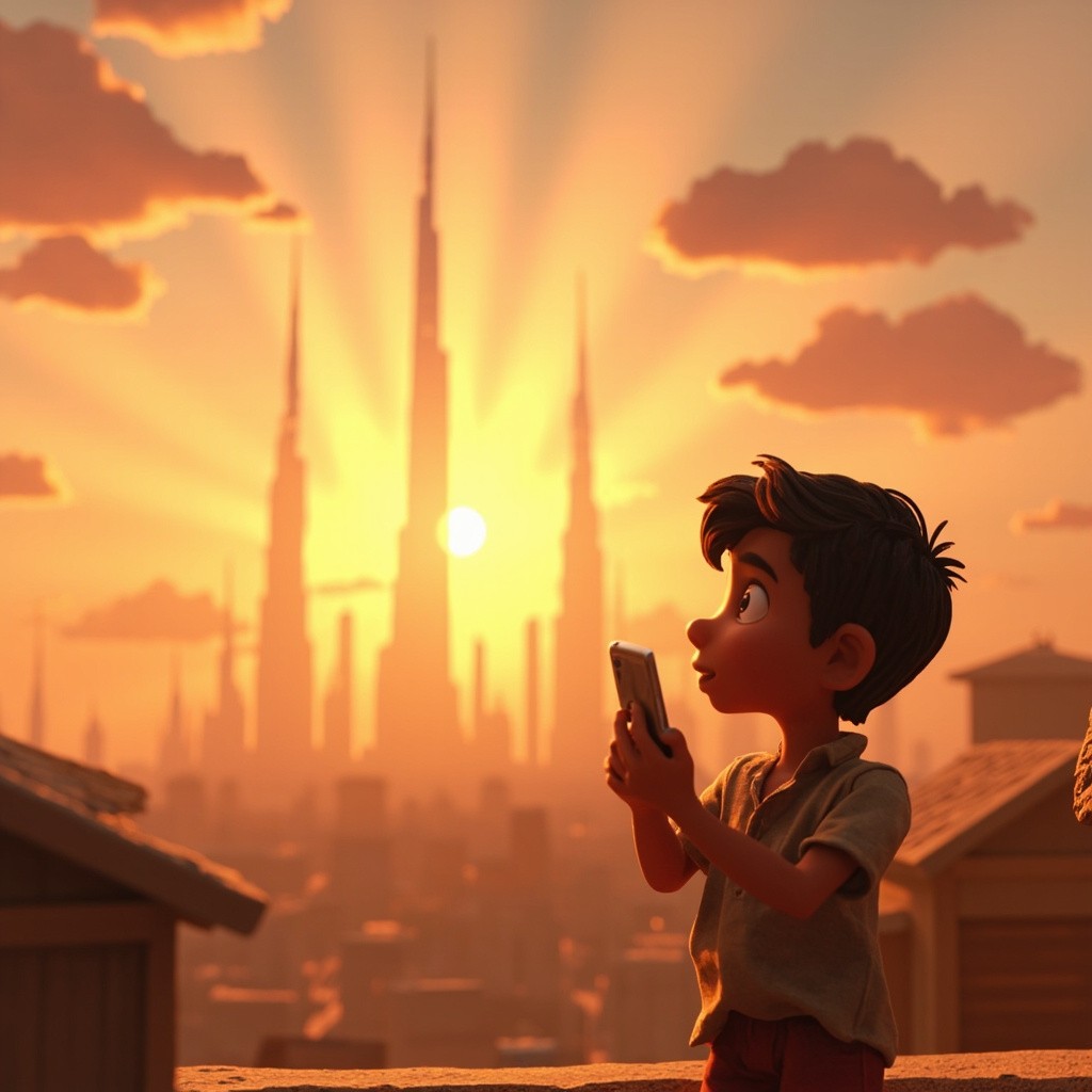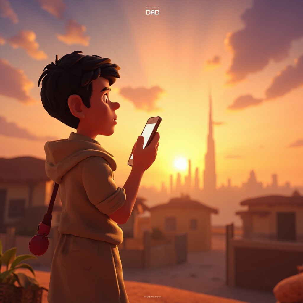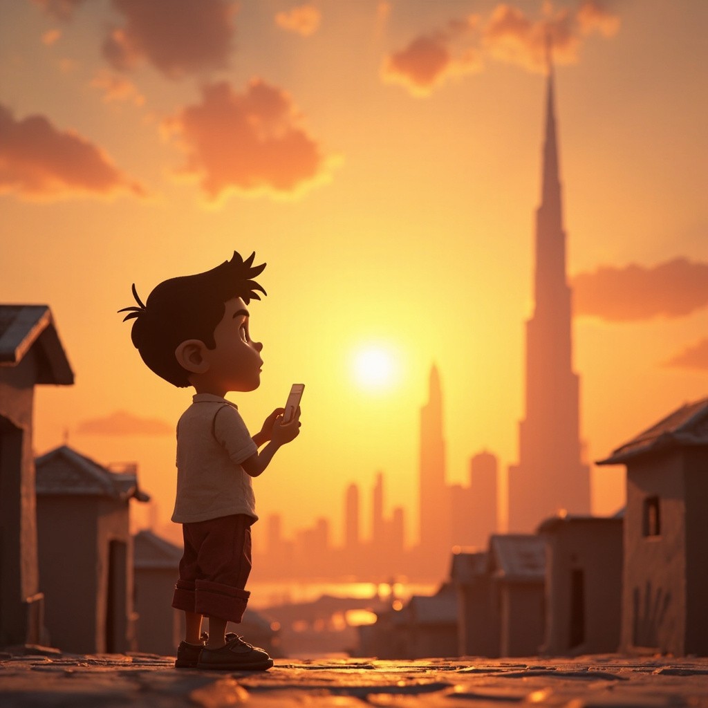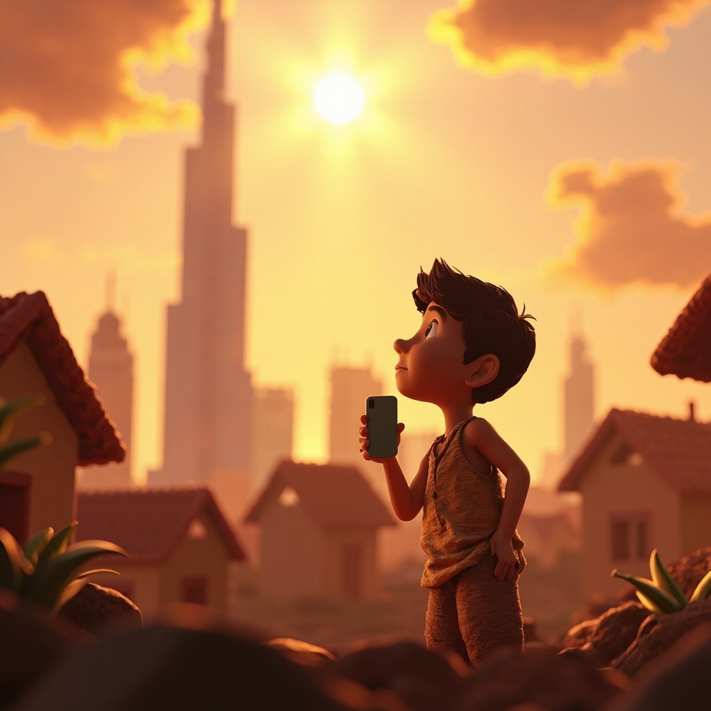 Indian Village Boy Viewing Dubai Skyline Cartoon 3D Illustration