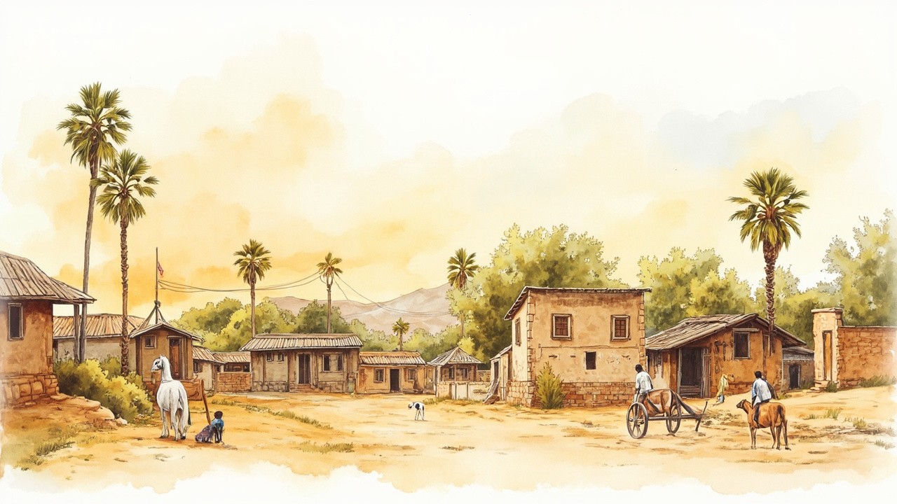 Hand-Drawn Watercolor Illustration of Indian Village Morning