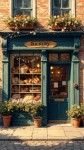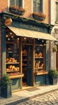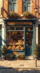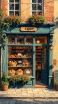 A charming small bakery in a European village, warm storybook illustration style, colorful but muted tones, detailed storefront with a wooden frame painted dark blue or green, large windows displaying baskets of fresh bread, croissants, baguettes, and pastries, flower boxes under the windows, cobblestone street, walls made of colorful bricks in soft pastel shades, soft afternoon light, cozy and nostalgic atmosphere, slightly textured vintage look, inviting entrance with a wooden sign that says "Bakery", fairy lights hanging above, whimsical and heartwarming, highly detailed