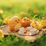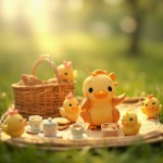 3D Illustration of Cute Brioche Character in Picnic Scene with Kawaii Chickens