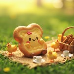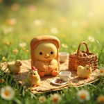 A cute, whimsical picnic scene featuring an adorable character made of buttery, golden-brown brioche bread with a smiling face. The brioche character is seated on a woven picnic mat on a lush green field. Surrounding it are tiny, kawaii-style chickens and chicks, one with a pink comb, all interacting joyfully. There’s a wicker basket filled with biscuits or cookies, tiny mugs and teacups arranged on the mat, and a cozy, warm afternoon light casting soft shadows. Ultra-detailed, pastel color palette, shallow depth of field, soft focus background, Toy Story-like charm, rendered in 3D illustration style.