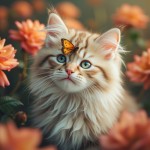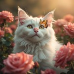 Fluffy White Cat with Butterfly on Nose in Rose Garden