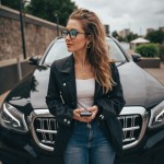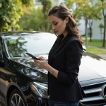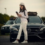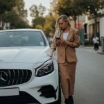 Young Woman Standing Beside Mercedes-Benz Focusing on Phone