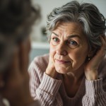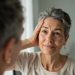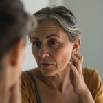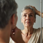 30 Year Old Woman Showing Grey Hair in Mirror Reflection