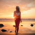 A 20-year-old woman, 155 cm tall, slim (50 kg), with white shoulder-length hair, wearing tight Shorts red leggings and a half-open pink sports jacket. She stands barefoot on the beach at sunrise, the light reflecting off the water. The sky is colored in warm orange, pink, and yellow tones. She is smiling relaxed, looking toward the horizon, a light breeze blowing through her hair. Style: realistic, high-resolution, photorealistic, cinematic lighting.*