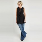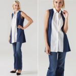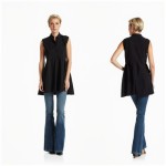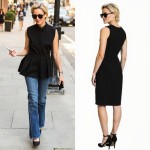 Woman in Norma Kamali Flared Mini Dress and Denim Jeans
