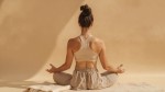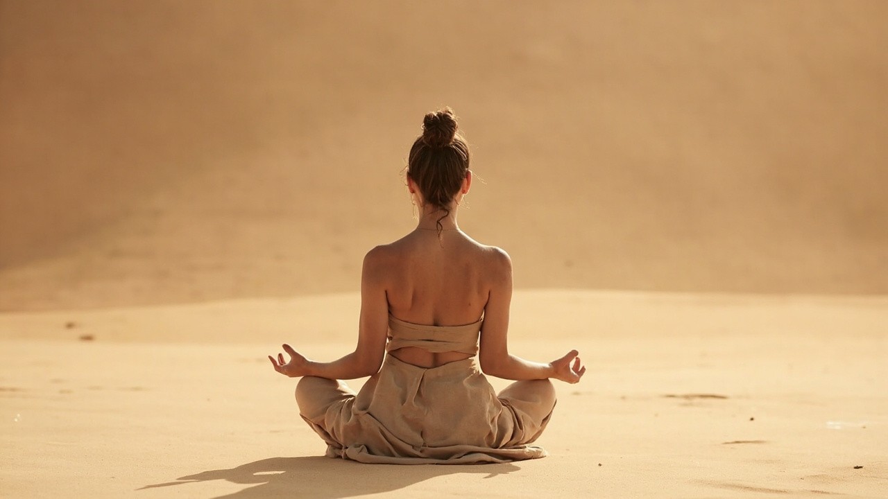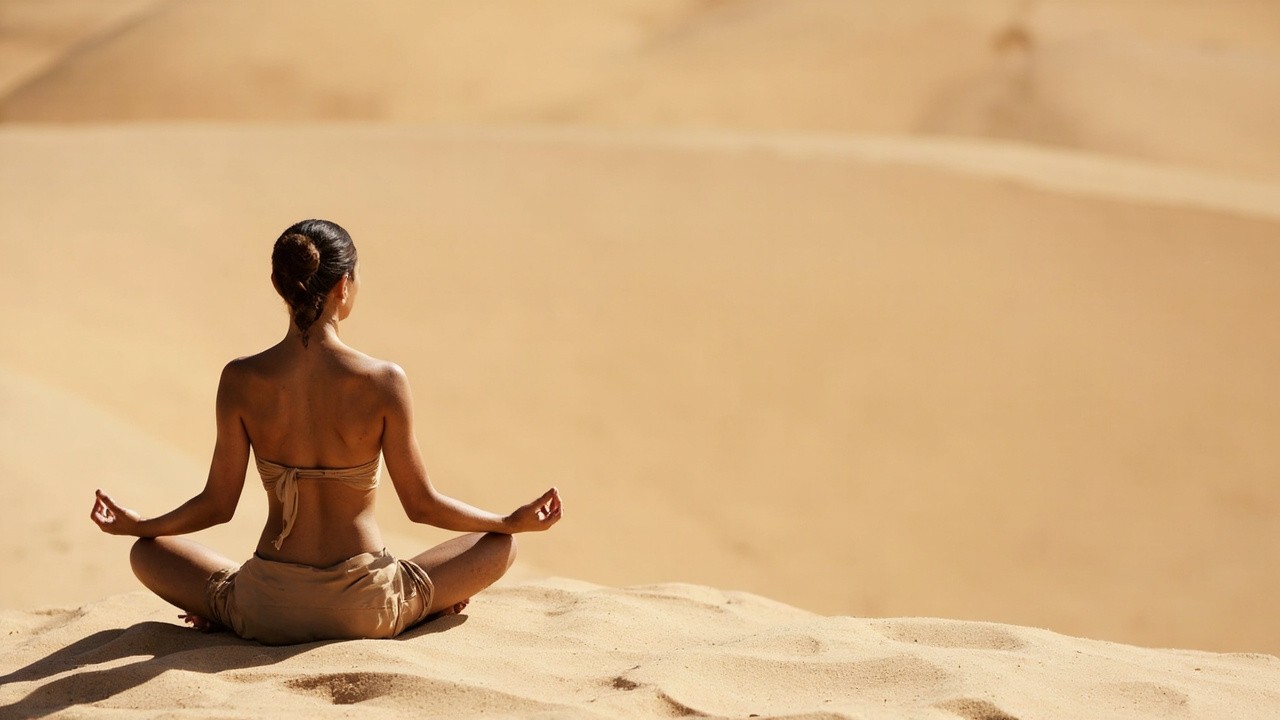 Meditating Woman in Lotus Position from Behind, Beige Sandstone Texture