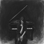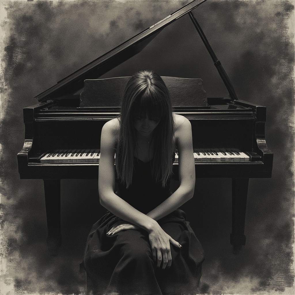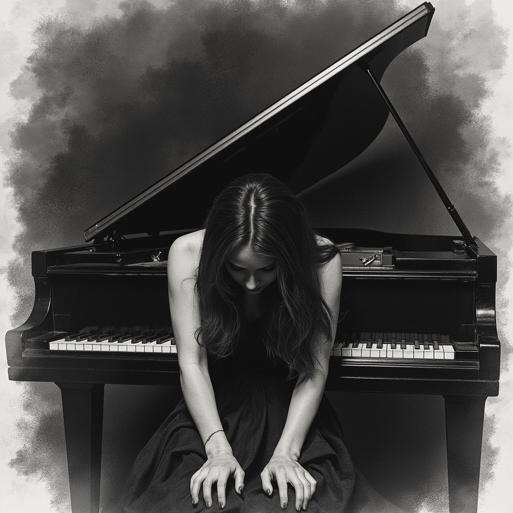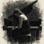 Front View Illustration of Long-Haired Woman Seated by Grand Piano