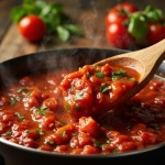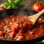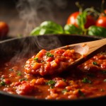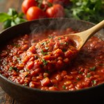 A close-up, high-resolution image of a wooden spoon stirring a thick, rich tomato sauce in a pan. The sauce is vibrant red, chunky with pieces of tomato and finely chopped green herbs. Steam rises gently from the hot mixture, creating a sense of warmth and freshness. The background is softly blurred, with hints of tomatoes and basil, evoking a rustic kitchen atmosphere."
