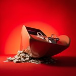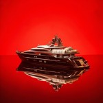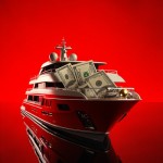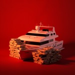 Studio Shot of Money, Travel, and Yacht on Red Background