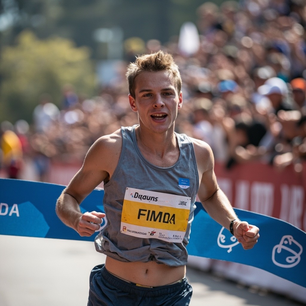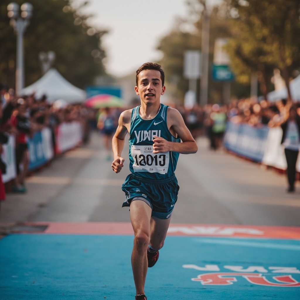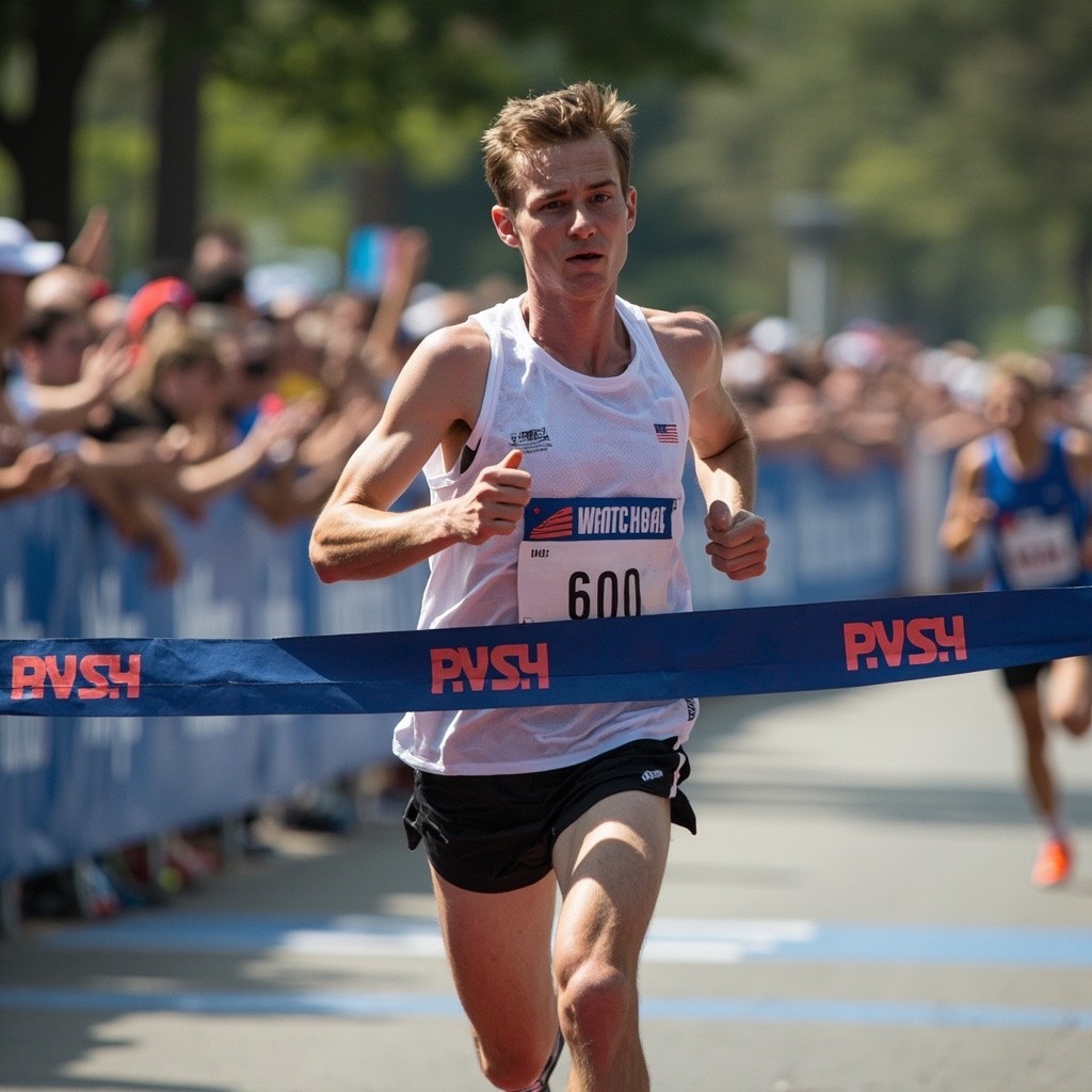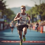 Young Athletic White-Skinned Runner Crossing Marathon Finish Line