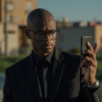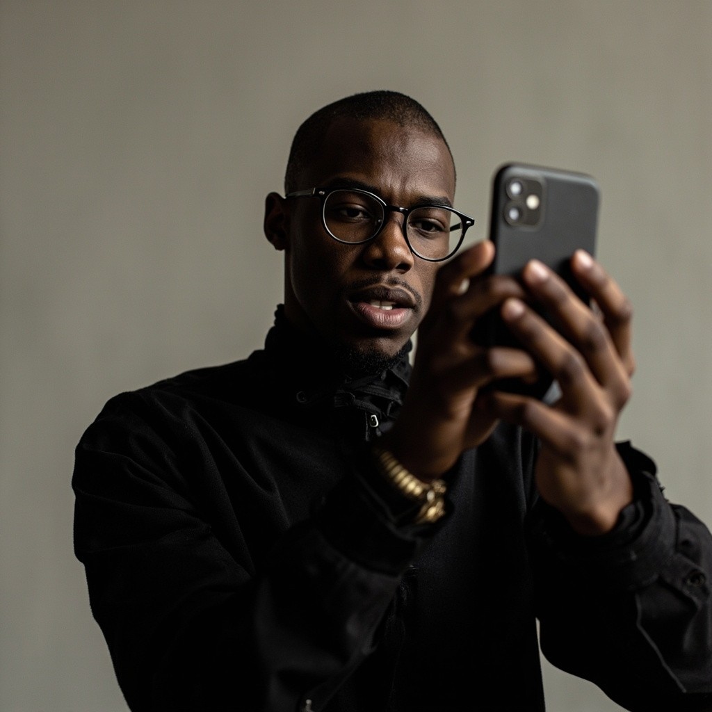 Young Black Man Filming with Phone, Wearing Glasses and Black Clothes