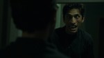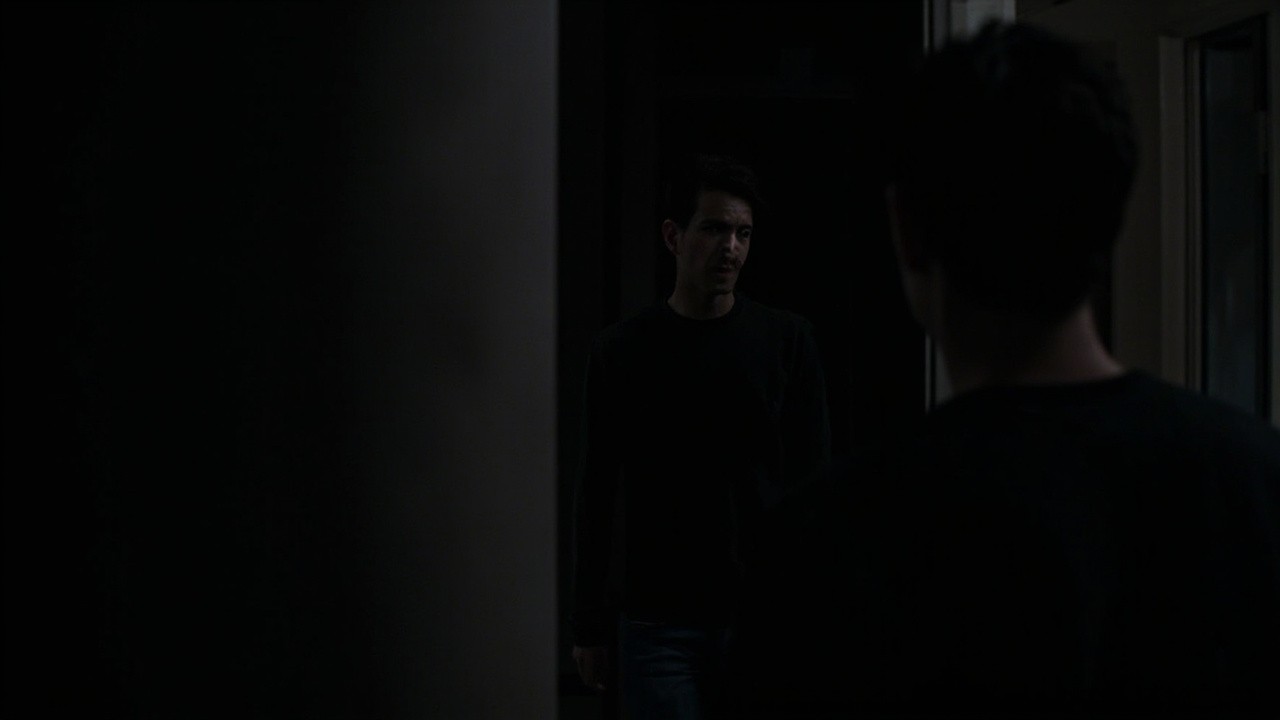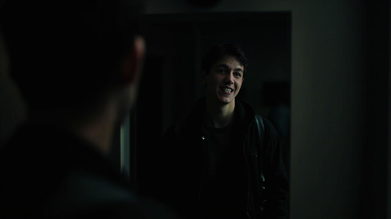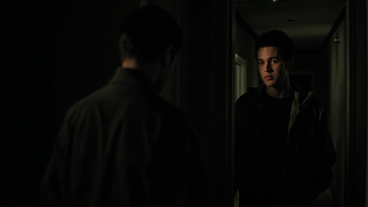Young Man and Sinister Mirror Reflection in Dark Hallway