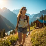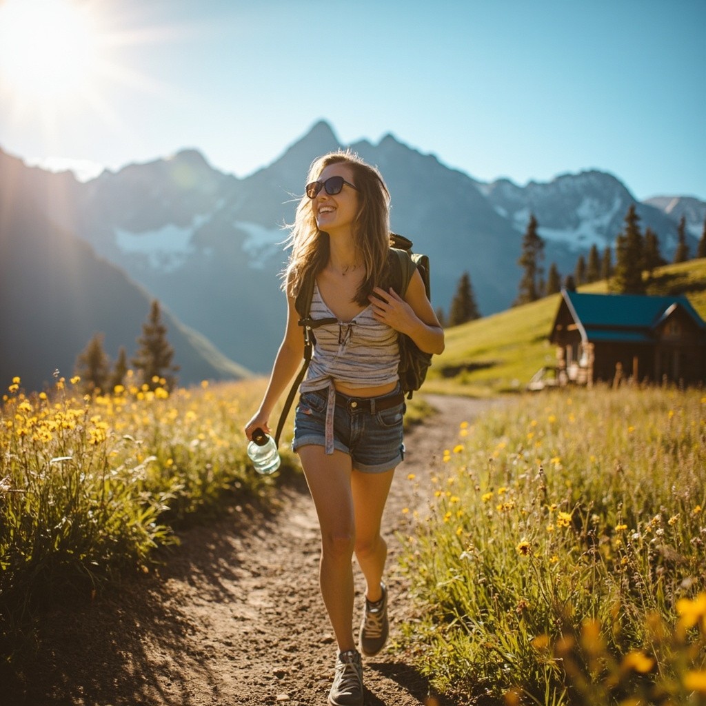 Một phụ nữ trẻ mặc trang phục mùa hè ngắn tự tin đi bộ dọc theo con đường mòn trên núi đầy nắng, mặc áo ba lỗ thoáng khí, quần short denim và giày thể thao chắc chắn, ba lô lắc lư nhẹ nhàng khi cô mang theo một chai nước, được bao quanh bởi những đồng cỏ hoa dại, những đỉnh núi phủ tuyết xa xa và một ngôi nhà gỗ quyến rũ có mái xanh dưới bầu trời trong vắt, ánh nắng vàng làm nổi bật nét mặt vui tươi của cô giữa không khí trong lành của miền núi.