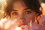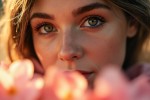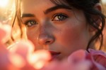 Dreamy Close-Up Portrait of Young Woman with Freckles and Blue Eyes, Sunlight Filtered through Petals