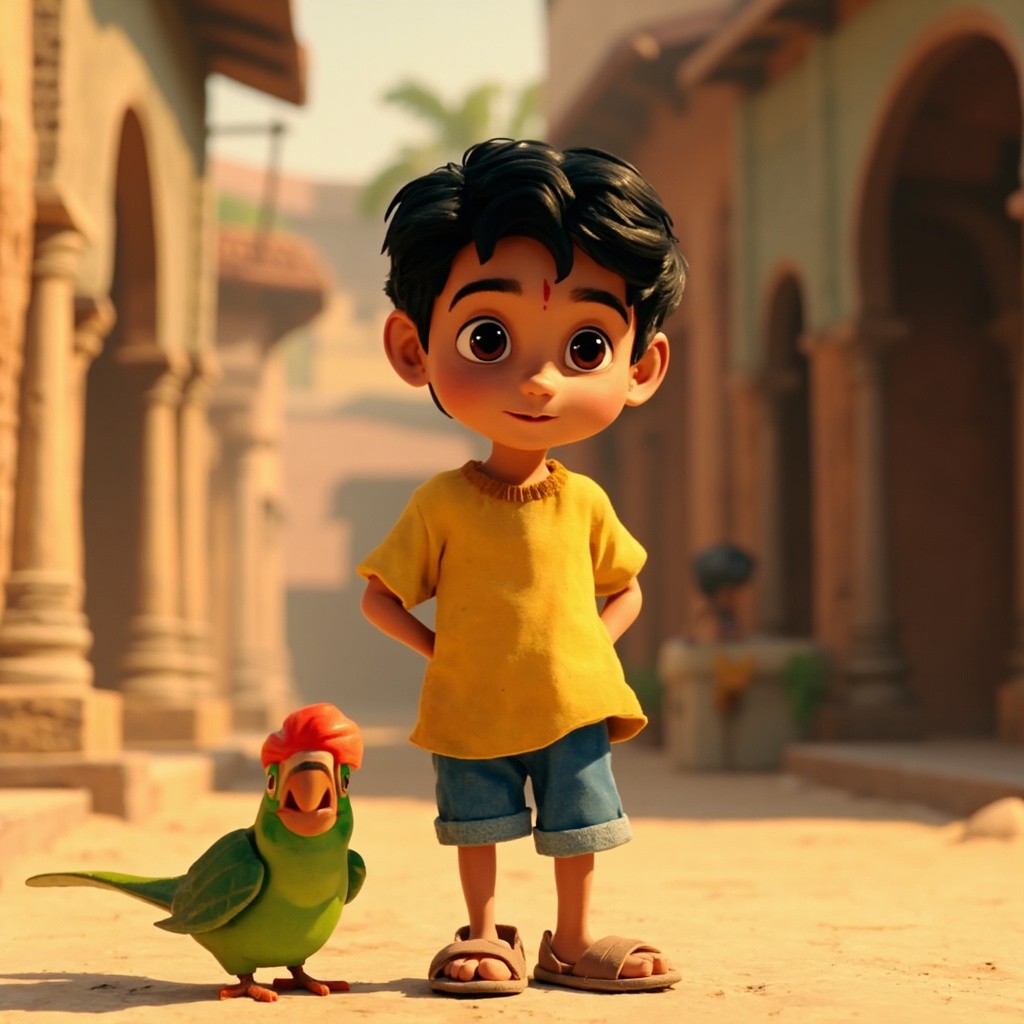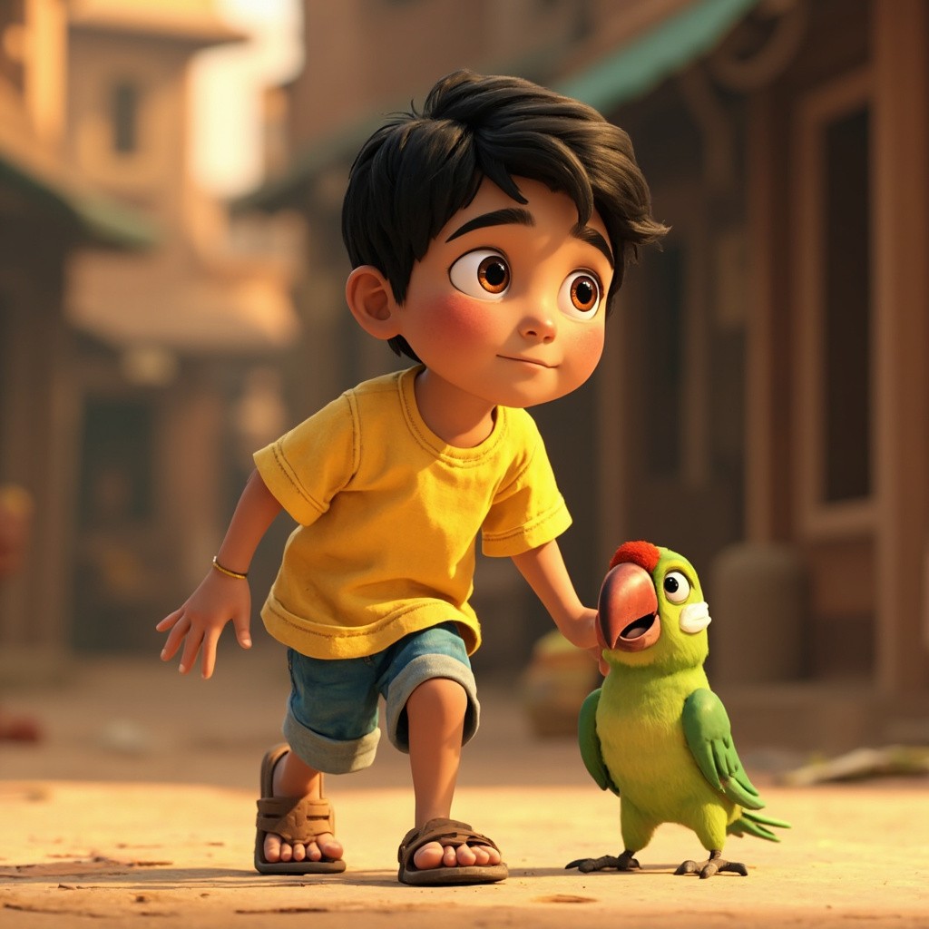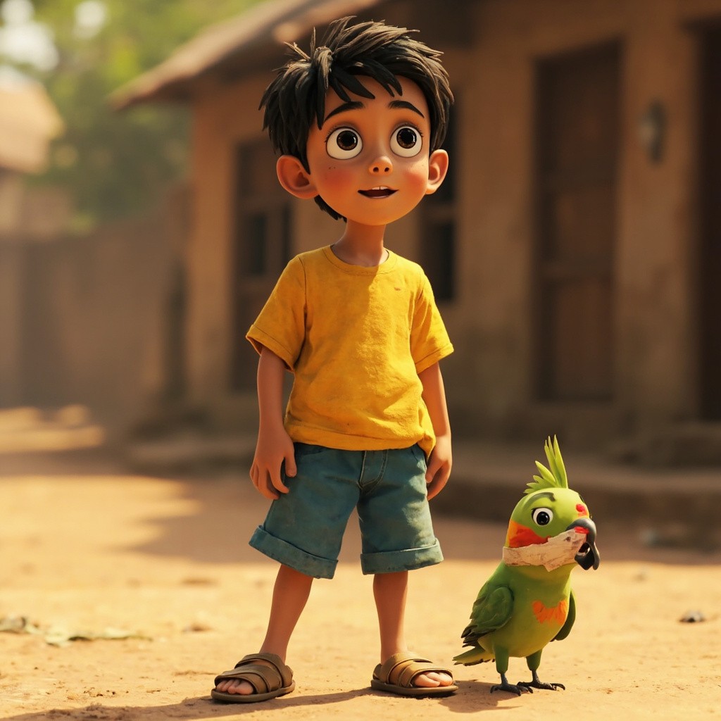 A 10-year-old Indian boy named Aarav with short black hair, big brown eyes, wearing a bright yellow t-shirt, blue shorts, and simple brown sandals, same face, same hairstyle, same clothes in every scene, accompanied by a small green parrot with a red beak (slight bandage on wing in early scenes), consistent character design, same proportions, same colors, highly consistent appearance across all frames, emotional expressions, soft lighting, detailed village environment, cinematic composition, smooth animation feel, 2D cartoon animation style, clean outlines, vibrant colors, Pixar-inspired but 2D, high quality, no character variation, no outfit change, no face change