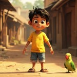 Indian Boy and Green Parrot Cartoon Illustration in Village Environment