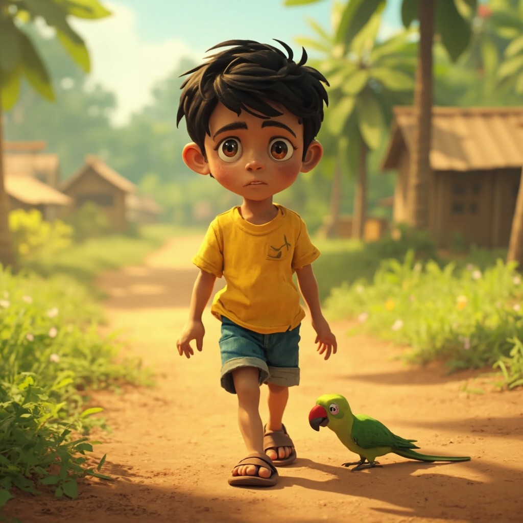 A 10-year-old Indian boy named Aarav with short black hair, big brown eyes, wearing a bright yellow t-shirt, blue shorts, and simple brown sandals, same face, same hairstyle, same clothes in every scene, accompanied by a small green parrot with a red beak (slight bandage on wing in early scenes), consistent character design, same proportions, same colors, highly consistent appearance across all frames, emotional expressions, soft lighting, detailed village environment, cinematic composition, smooth animation feel, 2D cartoon animation style, clean outlines, vibrant colors, Pixar-inspired but 2D, high quality, no character variation, no outfit change, no face change Aarav walking on a village dirt path, green fields and small huts in background, he notices an injured green parrot lying on the ground, worried expression, soft sunlight, 2D cartoon style, bright colors, consistent character design genrate this video
