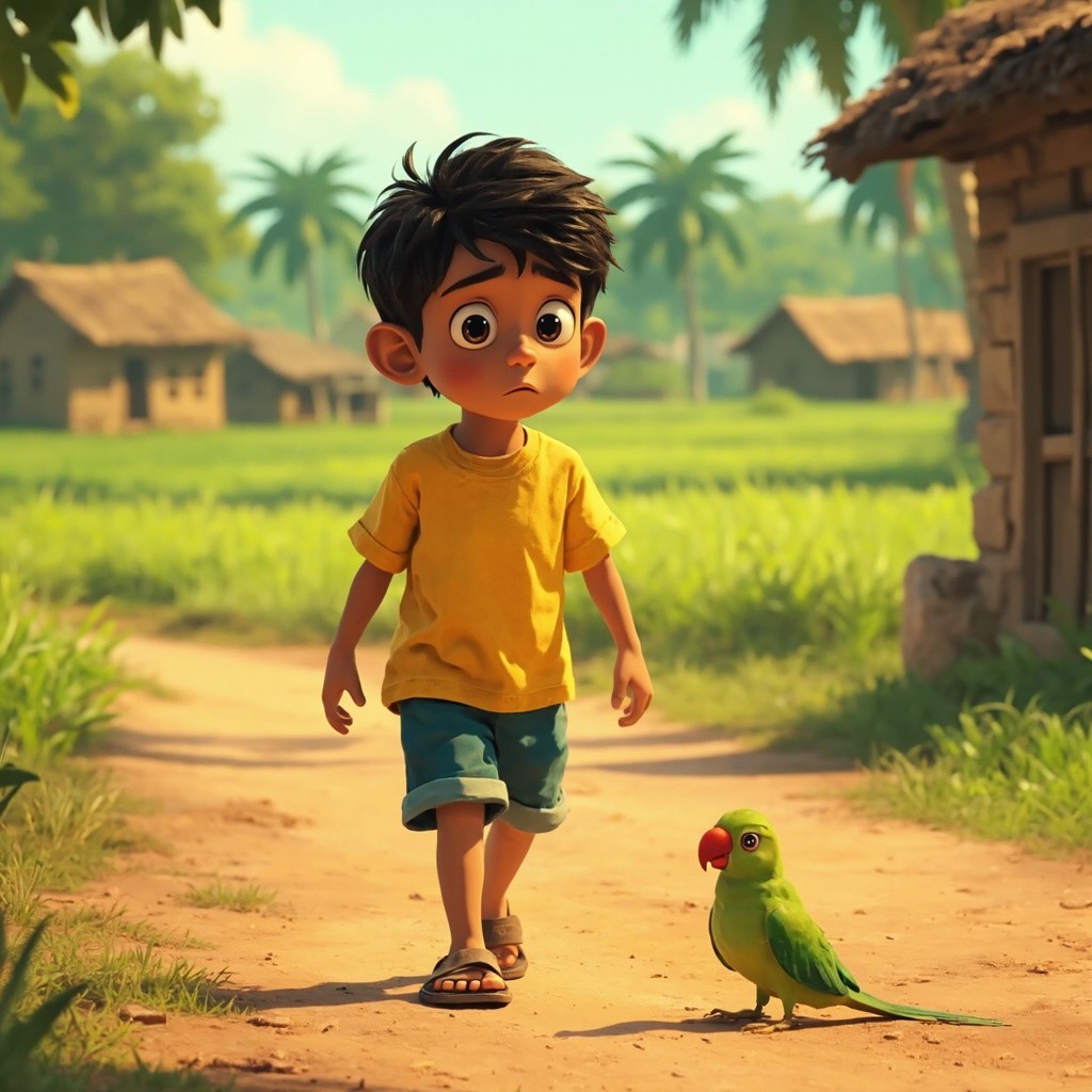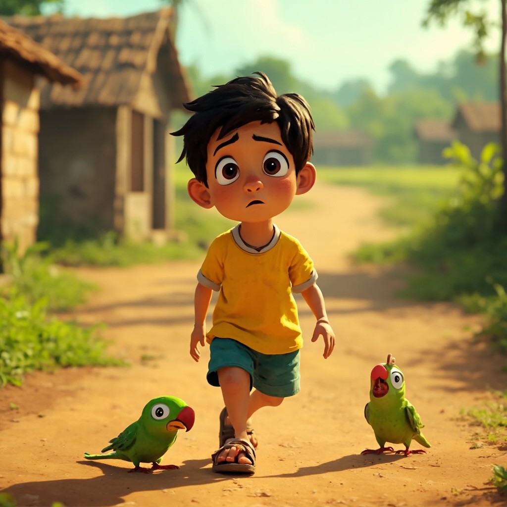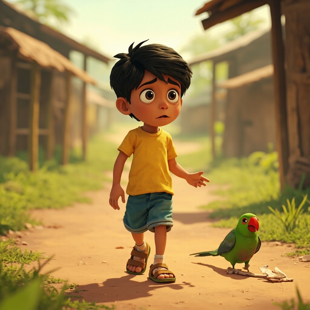 Indian Boy Aarav and Injured Parrot in Vibrant 2D Village Animation