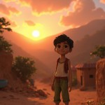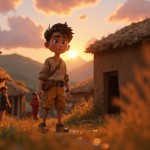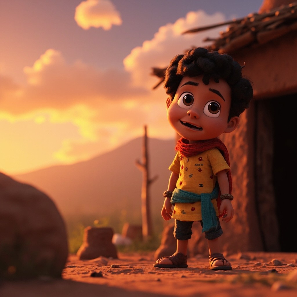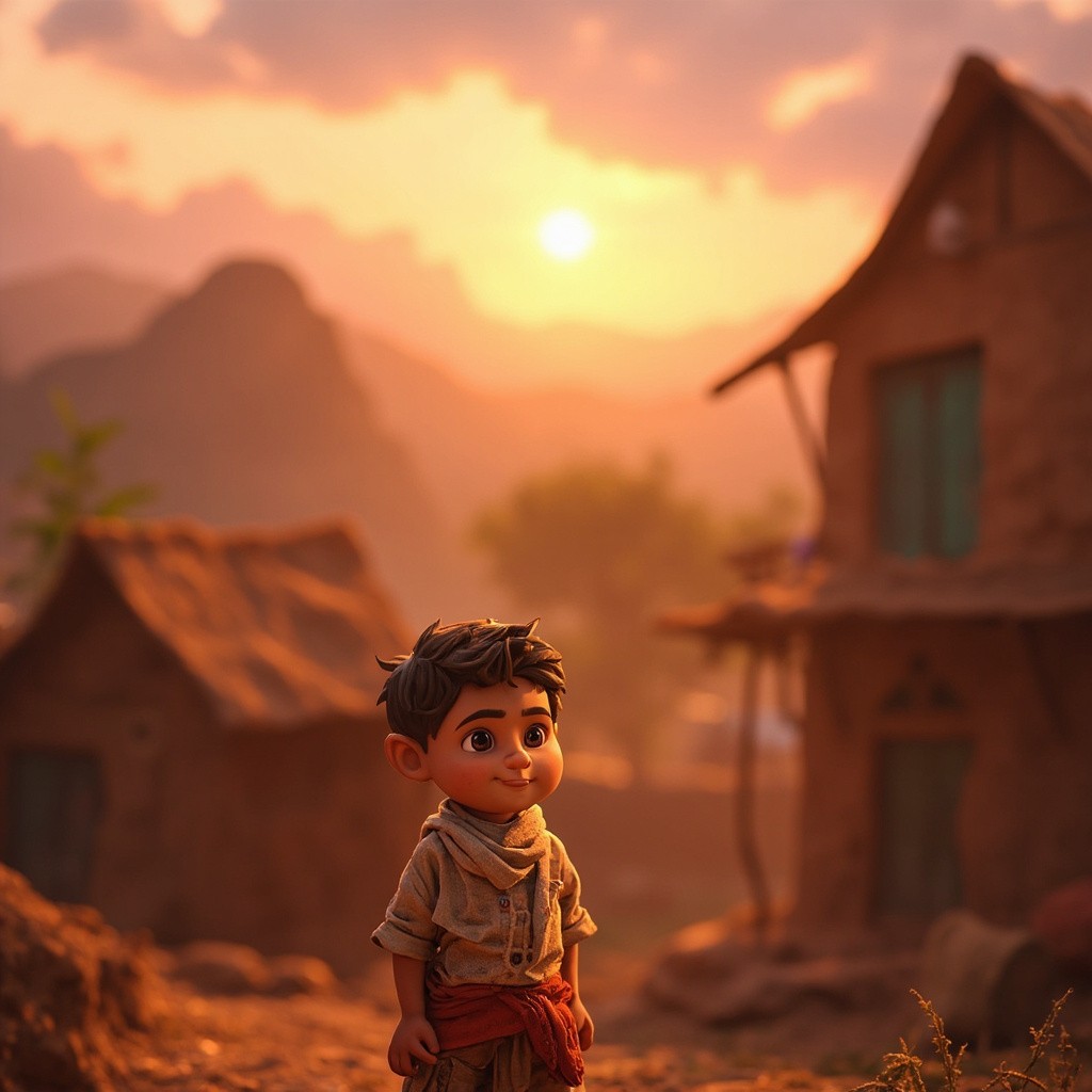 3D Cartoon of Indian Boy Standing Near Mountain Village House at Sunset