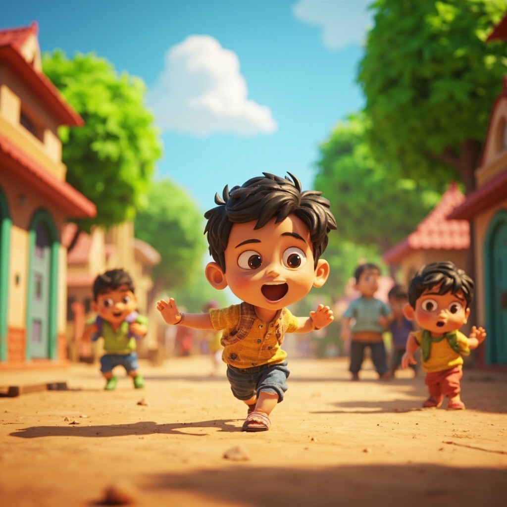 3D Cartoon of Indian Boy Aarav Playing in Vibrant Village