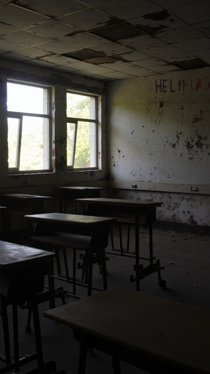 Abandoned School Classroom with Dirty Walls and 'Help Us' Inscription