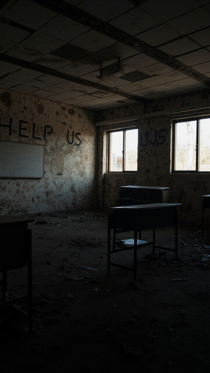 Abandoned School Classroom with Dirty Walls and 'Help Us' Graffiti at Night