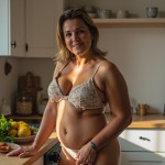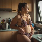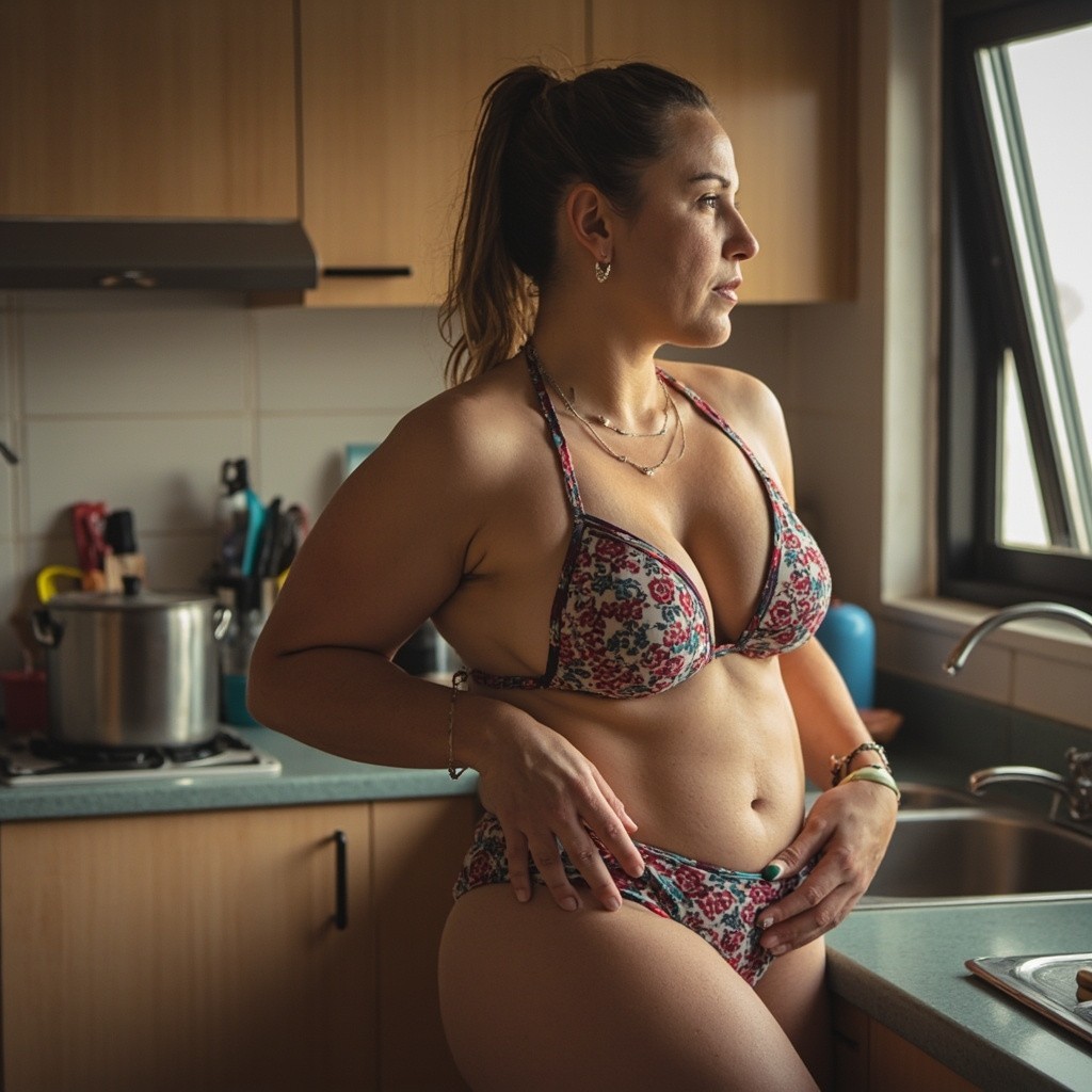 Adult Woman with Curvy Body Wearing Bikini in Kitchen