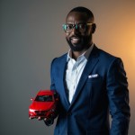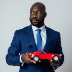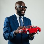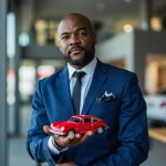 Professional African Businessman in Blue Suit Holding Red Car Model