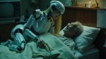 Korean Female Robot with Blonde Hair Comforting Elderly Chinese Man in Bedroom at Night