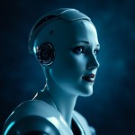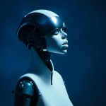 Artificial Intelligence Robot with White Body and Silver Face on Dark Blue Background