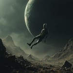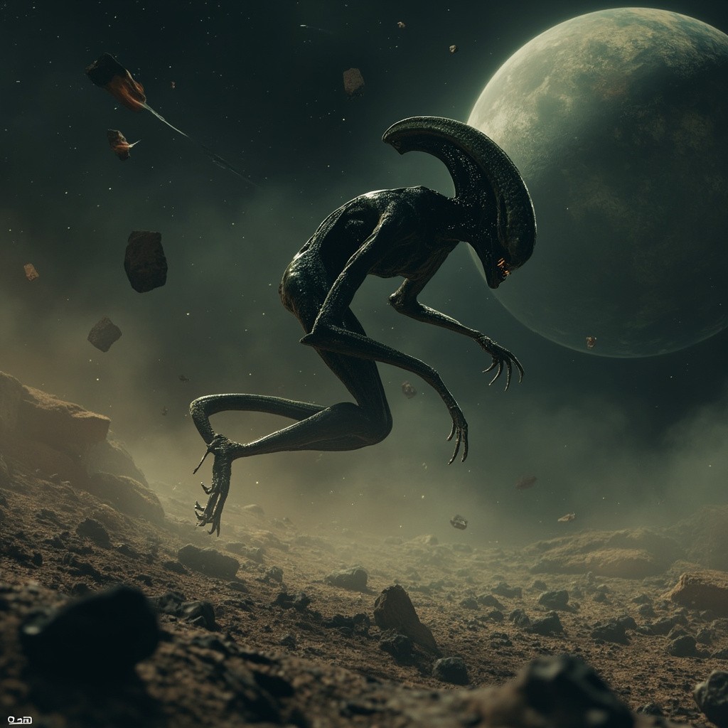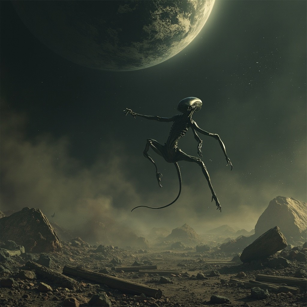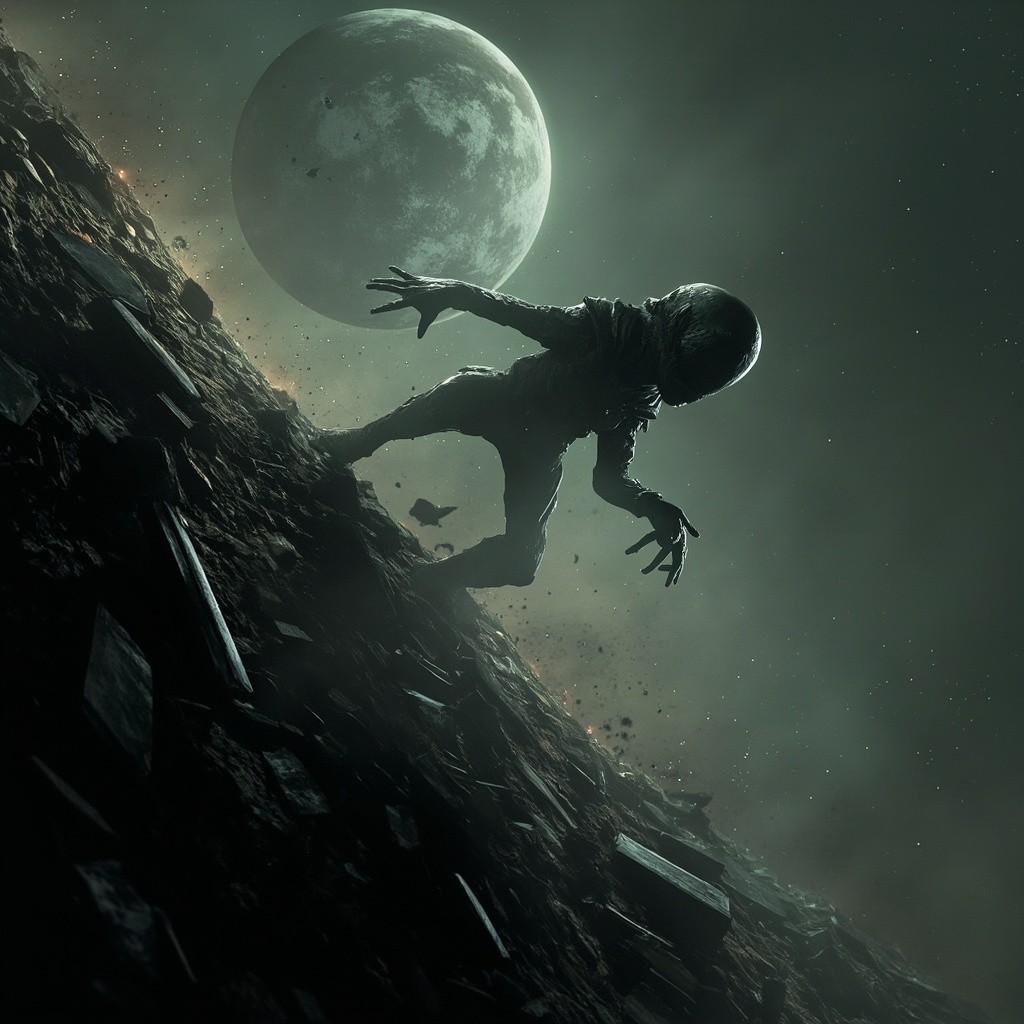 Alien Floating Amidst Ruins and Space Debris in Grey Tones