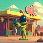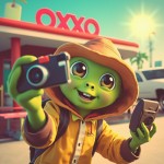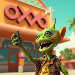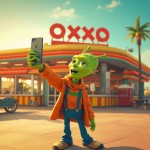 Friendly Alien Taking Selfie Outside OXXO in Mexico, Cartoon Style, Sunny Background, Digital Art