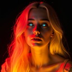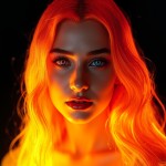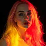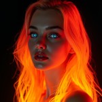Portrait of Young Woman with Gradient Hair and Glowing Blue Eyes on Black Background